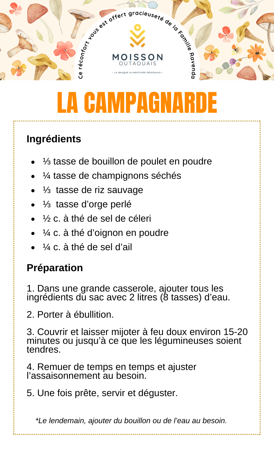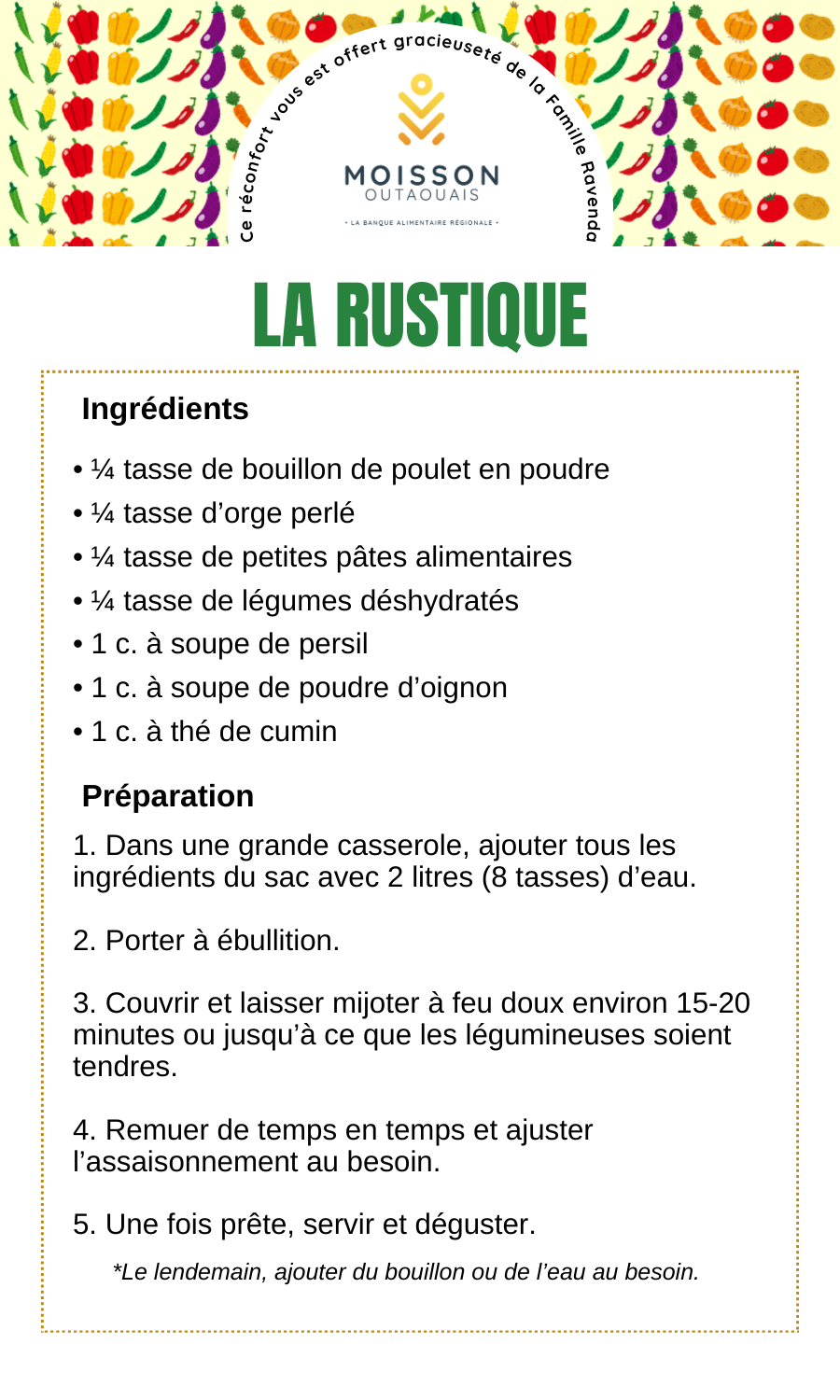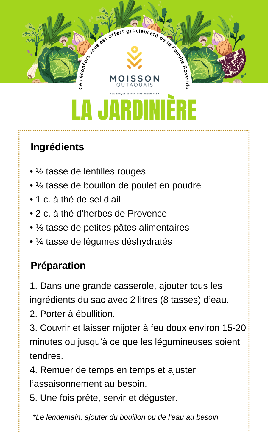 Le projet consiste à produire, dans notre cuisine de transformation, des repas nutritifs composés d’ingrédients séchés, pensés pour être simples à conserver et à préparer. Distribués à notre réseau de 51 organismes affiliés, ces repas permettront de bonifier l’offre de dépannage alimentaire, afin de répondre plus efficacement aux besoins croissants des personnes et des familles en situation de précarité.